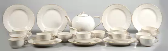 Lot 456 | KPM-Teerestservice, Neuozier mit Goldrand und Goldstaffage, bestehend aus Teekanne, kleinem Sahnekännchen, 13 Teetassen, 7 Untertassen (1x Goldrand berieben) und 7 Kuchentellern, blaue Zeptermarke und Reichsapfel in Grün…