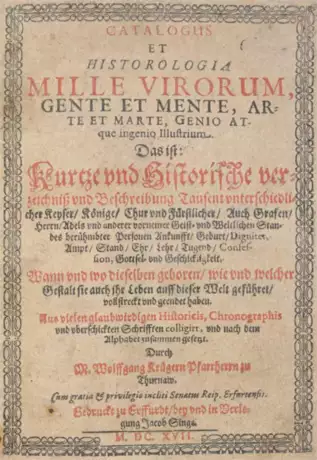 VD17 3:301414B. Zweite Ausgabe (kollationsgleich wie die ein Jahr zuvor erschienene Erstausgabe). - Seltenes, biographisches Handbuch des Historikers W.Krüger aus Ruppersdorf. Titel gebräunt u. angestaubt, Widmungsbl. mit repariertem Eckabriss, 2 Bll. Vorstücke mit hinterlegtem kl. Loch im weißen Rand, vereinzelt mit Bleistiftunterstreichungen, gest. Wappen-Exlibris "Nordkirchen" am Innendeckel, Ebd. leicht fleckig.