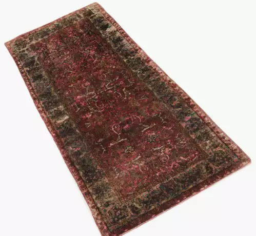 NW-Türkei, um 1900. Flormaterial und Kette reine Seide. Extrafeine Knüpfung. Dichtes florales Werk mit Metallbroschierung. Das rote Mittelfeld ist mit elegant platzierten, miteinander verbundenen Blütenpalmetten und Gabelranken geschmackvoll überzogen. 2 filigrane Borten grenzen an die grosszügig angelegte, türkisblaue, mit Wellenranken und alternierenden Palmetten geschmückte Hauptbordüre. Brüchig, mehrere Risse und Löcher, starke Gebrauchsspuren. 60x148 cm (ft. 2x.4.9).
