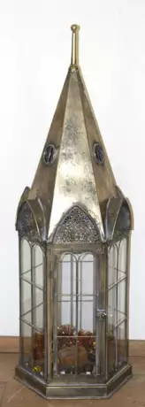 Lot 1006 | Laterne/ Windlicht, in Form eines Turmes, messingfarbenes Metall, 6-seitig verglast mit gesprossten Fernstern und 1 Tür, H. 93 cm
