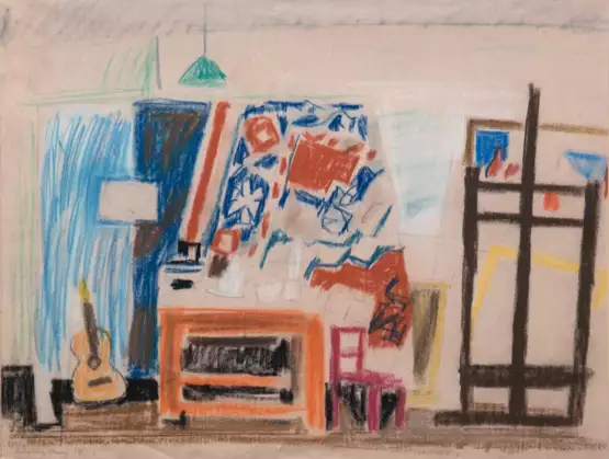 Lot 104 | Laves, Werner (1903 Berlin-1972 ebenda) "Atelierstilleben", Ölkreide auf Bütten, sign. und dat. 1951, verso. Nachlaßstempel, unten mittig kl. Riß und 1 Ecke fehlt, 46x58 cm, ungerahmt