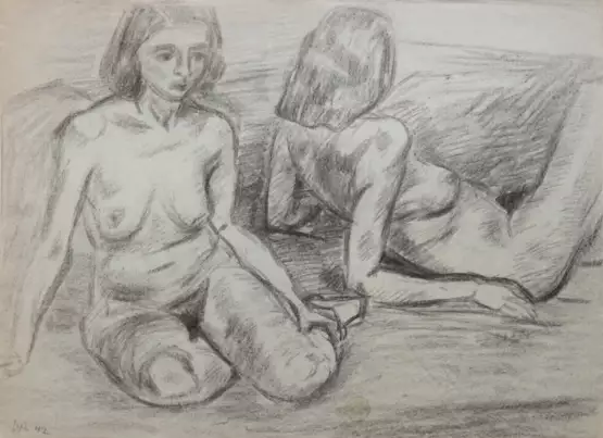 Lot 105 | Laves, Werner (1903 Berlin-1972 ebenda) "Zwei weibliche Akte", Kohle auf Bütten, monogr. und dat. ´42, verso. Nachlaßstempel, 49x63 cm, ungerahmt