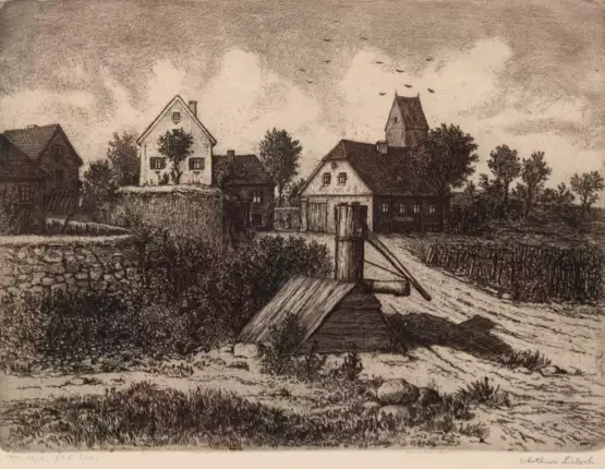 Lot 273 | Liebsch, Arthur (1851 Leipzig-1931 ebenda) "Dorflandschaft mit Ziehbrunnen", Radierung, 3/ 10, sign. u.r. und dat. "11.6.1926", 15x20 cm, hinter Glas und Rahmen