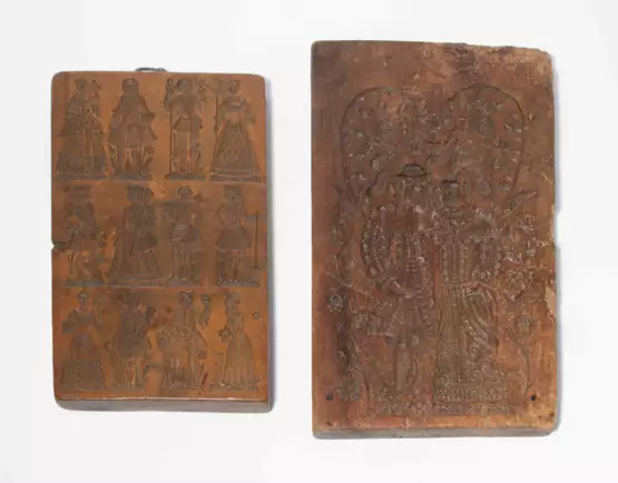 Holz mit vertieft geschnitzten Motiven. Rechteckig. (1) Um 1700. Galantes Paar. Rückseitig Initialen "A M" und später geschnitzte Motive. 31,5x19 cm. (2) Mitte 18.Jh. Beidseitig figürliche Darstellungen, u.a. Jägerpaar, Allegorien der 4 Jahreszeiten etc. (recto) bzw. Hirsch, Pfau, Papagei etc. (verso). 27x16,5 cm.