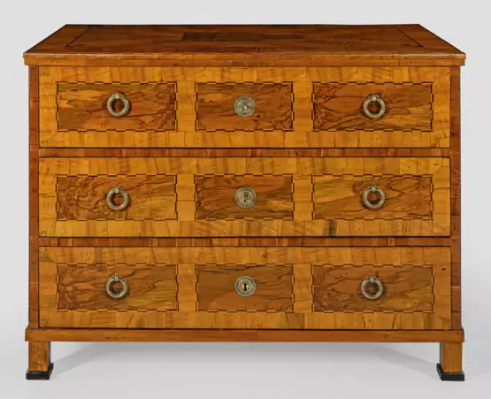 Nussbaum und Nussbaummaser, furniert sowie Einlagen aus unterschiedlichen Hölzern. Gerader, querrechteckig angelegter Korpus auf schmaler Zarge und gekanteten Füßen. In der gegliederten Front drei breite Schubladen. Gering überstehende Deckplatte. Flächendeckend breit gerahmte Furnierfelder, von ornamentierten Bandeinlagen begrenzt. H. 84 cm. 111 cm x 58 cm.