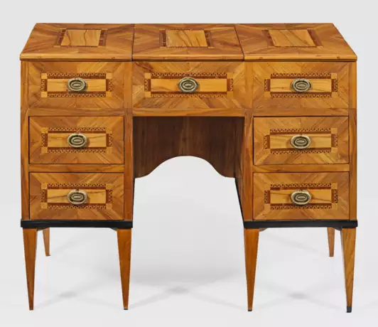 Nussbaum, Ahorn und Pflaumenholz, furniert. Gerader, querrechteckig angelegter Korpus auf schmaler Zarge und erg. konischen Vierkantbeinen. In der gegliederten Front gekantetes Kniefach, flankiert von je zwei Schubladen. Gering überstehende, seitlich aufklappbare Deckplatte, mittig mit aufstellbarer Spiegelfläche. Flächendeckend breit gerahmte Furnierfelder, von Bandeinlagen begrenzt. H. 81 cm. 100 cm x 44 cm.