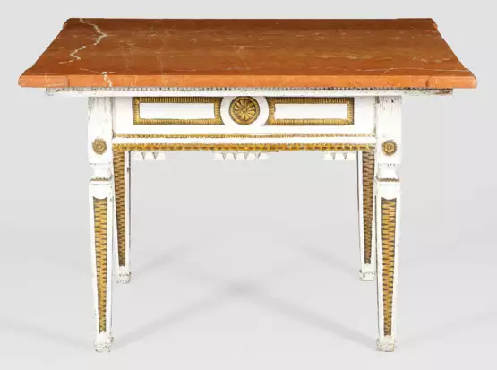 Holz, weiß gefasst und teilw. vergoldet. Gerade, profilierte Zarge mit reliefierten Rosettenmotiven auf mehrfach gegliederten, gekanteten Balusterbeinen. Weit überstehende rechteckige Deckplatte mit erg. aufgelegter, verkröpfter Deckplatte aus sog. Rosa Tea Marmor, rest.; H. 77 cm. 114 cm x 94 cm.