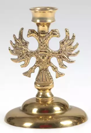 Lot 530 | Lübecker Miniaturleuchter, Messing, 1-flammig, auf rundem Fuß, figürlicher Schaft mit Doppelkopfadler mit Brustschild, H. 8 cm
