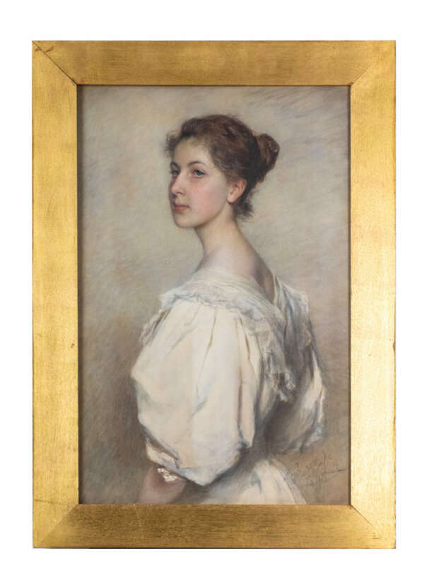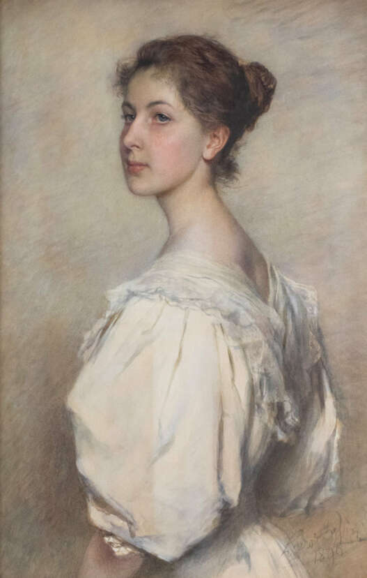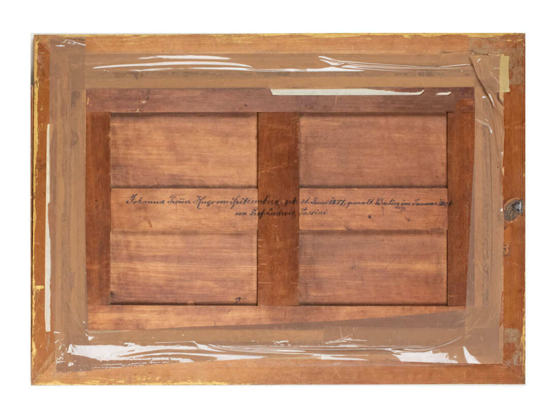 Portrait of Johanna Freiin Hugo von Spitzenberg, watercolour and pastel on paper, mounted on parquetry wood panel, 57 x 37 cm, signed, dated 1896, inscribed on the reverse: Johanna Freiin Hugo von Spitzenberg, born 21 June 1877, painted in Berlin in January 1896 by Prof. Ludwig Passini.