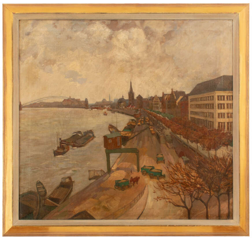 Das Mannesmannufer in Düsseldorf, oil on canvas, 75 x 80 cm, signed, craquelured, in need of cleaning
