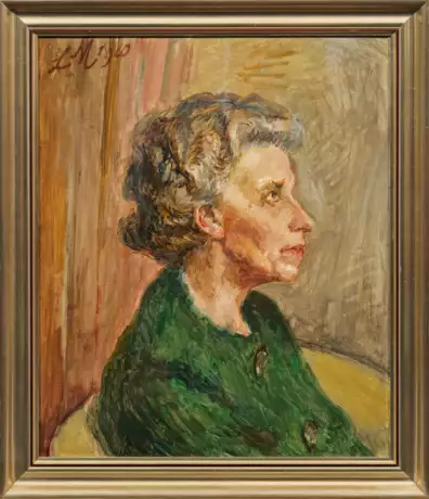 Vor neutralem Hintergrund die ältere Dame im Profil, ausgeführt mit breiten, dynamischen Pinselstrichen. Öl/Lwd., kaschiert auf Karton. L. ob. monogr. und dat. (19)60. 58,5 cm x 48,5 cm (Sichtmaß). Rahmen.