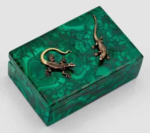 A malachite box with a pair of gilt silver lizards. Standard mark 84.