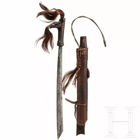 Leicht geschwungene, etwas fleckige Rückenklinge mit kräftiger Fehlschärfe und typisch auslaufender Spitze. Der ornamental beschnitzte Hartholzgriff mit rattanumwickelter Hilze und eingesetzten Kunsthaar(?)-Büscheln leicht schwundrissig. Reich mit graviertem bzw. geflochtenem Dekor verzierte Holzscheide, am Mund und Ort schauseitig verbeint, auf der Rückseite Tasche aus Pflanzenfasern (ohne fehlendes Beimesser). Länge 66 cm.