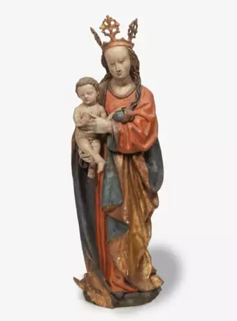 Deutsch, 16.Jh. Holz geschnitzt und polychrom gefasst, partiell vergoldet. Auf Terrainsockel stehende Maria, das Kind mit Apfel im Arm haltend. Rückseitig gehöhlt. H 106 cm.