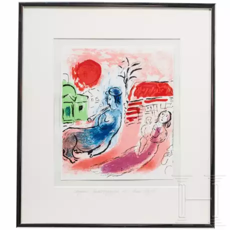 Erschienen in Jacques Lassaigne, Chagall, Paris 1957. Druck bei Mourlot, Paris. Eines von 6.000 unsignierten Explaren. Hinterglas gerahmt. Blattmaß 24 x 20,5 cm, Maße mit Rahmen 41 x 36 cm.