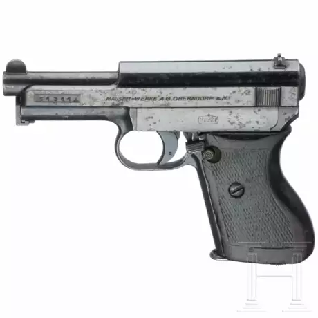 Cal. 7,65mmBrowning, SN. 513114, nummerngleich. Leicht matter Lauf, Länge 85 mm. Achtschüssig. Beschuss Doppelkrone/U und dt. Beschuss 1997. Links am Verschluss einzeilige Firmierung, am Rahmen Mausertonne, rechts Kaliberangabe und "D.R.P.u.A.P.". Originale Brünierung mit Tragespuren. Einteilige, dunkle Nussholzgriffschale mit kleinen Ausbrüchen entlang der Ränder. Magazin.