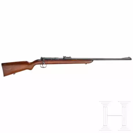 Cal. .22lr, SN. 164025, nummerngleich. Leicht rauer Lauf mit Prismenschiene und Visier 30 - 200 m. Lauflänge 65 cm. Beschuss Krone/"BUG". Fertigung ca. 1938. Auf dem System kleine Mausertonne, links Firmierung. Laufoberseite fleckig und stellenweise etwas feinnarbig. Heller Nussholzschaft, rechts am Kolben Mauser-Logo. Stahl-Kolbenkappe mit großer Mausertonne. Sammlerwaffe in noch guter Erhaltung. Länge 113 cm.