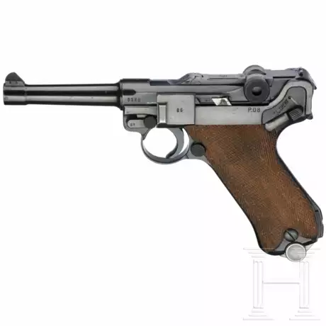 Cal. 9mmLuger, SN. 5286d, nummerngleich inkl. Schlagbolzen. Rauer Lauf, Länge 100 mm. Achtschüssig. Am Hülsenkopf "42", am Vordergelenk "byf". Abnahme Adler mit "135", Adler mit "136" und Adler mit "HK". Vollständig nachbrüniert, Tragespuren. Dunkle Nussholzgriffschalen. Brüniertes Magazin mit Aluboden, nicht nummerngleich.