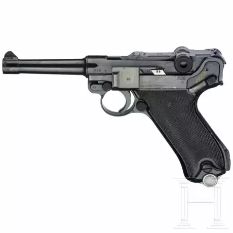 Kal. 9mmLuger, Nr. 886 r, nummerngleich inkl. Schlagbolzen. Leicht rauer Lauf, Länge 100 mm. Achtschüssig. Dt. Beschuss. Hülsenkopf gemarkt "41", Vordergelenk "byf". Div. Abnahmen Adler/"655" und Adler/HK. Vollständig nachbrüniert. Schwarze Kunststoffgriffschalen. Nummerngleiches Falzmagazin mit Aluboden.