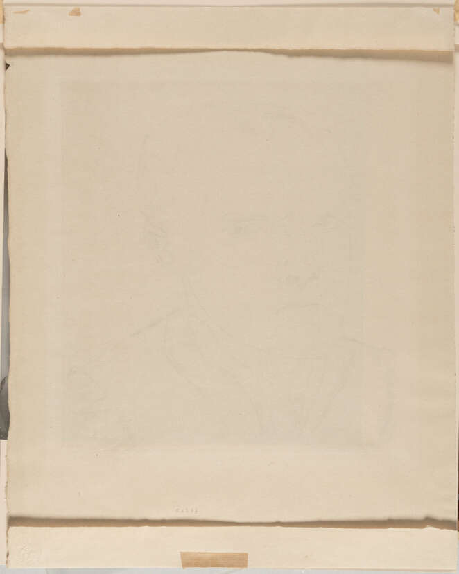 Unterm Passepartout schwach gebräunt, vereinzelte winzige Fleckchen, leichte Griffknicke. Links unterhalb der Darstellung leichte Druckstellen, rechts oben kleine Papierunregelmäßigkeit an der Kante. Oberer und unterer Blattrand jeweils mit horizontalem Falz und Montierungsbändern. Sonst insgesamt in guter Erhaltung.