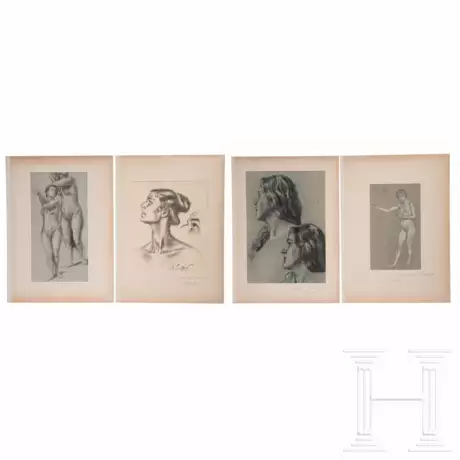 Fein in Graphit gezeichnete Körper- und Profilstudien. Zwei Blätter datiert auf 1899 bzw. 1905. Jeweils in Passepartout mit Künstlerstempel und leicht vergilbten Rändern. Verso teils auf Papier geklebt. Die Doppelprofilzeichnung mit kleinem Riss in der oberen Hälfte und einem Wasserschaden, das Passepartout an einer Stelle gerissen. Gesamtmaße mit Passepartout je 46 x 34 cm.