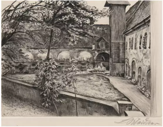 Lot 209 | Meidner, Ludwig (1884 Bierutów, Polen-1966 Darmstadt) "Klosterhof Grüssau", Radierung, sign. u.r., 15x18,5 cm, ungerahmt
