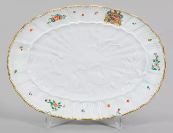 Ovale, leicht vertiefte Form. Im Spiegel feiner muschelförmiger Reliefdekor (Schwanendessin) aus zwei einander zugeneigten Schwänen, einem fliegenden und zwischen hohem Schilf stehendem Reiher. Auf der gerippten Fahne Indianische Blütenzweige und Streublumen sowie das Allianzwappen von Graf Heinrich von Brühl und seiner Gemahlin Franziska von Kolowrat-Krakowsky. Gekämmte Goldkante. Goldrand. Entw. nach Johann Joachim Kaendler und Johann Friedrich Eberlein. Modell-Nr. 5307. Schwertermarke. 30 cm x 22 cm.