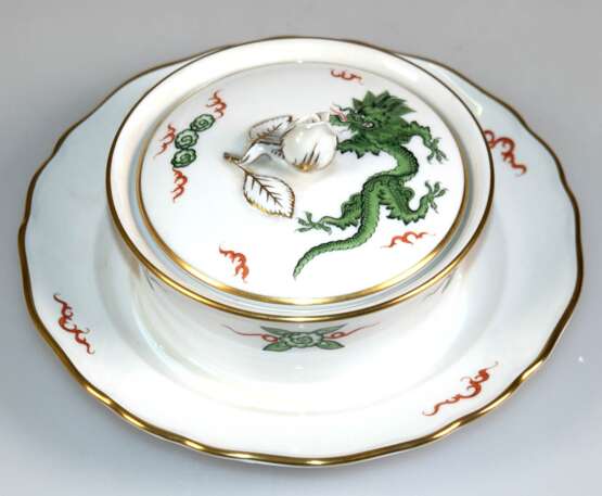 Lot 430 | Meissen-Butterdose auf festem Unterteller, rund, 20. Jh., Mingdrache grün mit Goldrändern, Schwertermarke mit 4 Schleifstrichen, Ges.-Dm. 17 cm