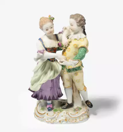 Um 1900. Modell von August Ringler, ca. 1895. Porzellan, polychrom bemalt. Goldstaffierung. Tanzendes Paar mit Blumenstrauss auf Rocaillensockel. H 14,5 cm.