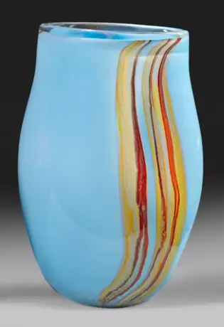 Ins Oval gedrückte Form. Farbloses Glas mit hellblau-grauem Unterfang und asymmetrischem, eingeschmolzenem Dekor aus einem auf den beiden Hauptseiten hochgezogenem, breitem Band in unterschiedlich gestreiften, ockerfarbenen, roten, violetten, graublauen und dunkelbraunen, erdfarbenen, sich teilw. vermischenden Tönen. H. 26,5 cm.