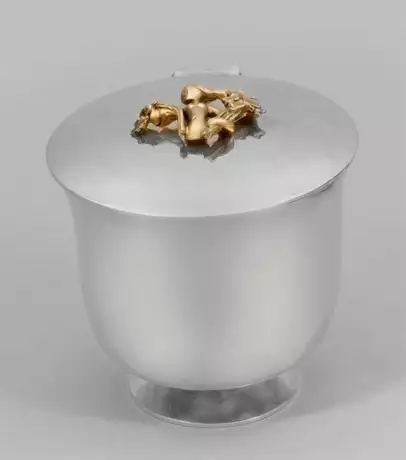 Silber, teilw. vergoldet. Über rundem Fuß kelchförmiger Korpus mit leicht aufgewölbtem Scharnierdeckel. Darauf mittig aufgelegt die vergoldete, in moderner Weise stilisierte Darstellung eines nach links blickenden jungen Mädchens in Halbfigur, das mit wehendem Haar zwei große Blumensträuße in den Armen hält. Unterseitig undeutl. Künstlermonogramm "HZ" in Kreis. Gew. 150 g. H. 7 cm. D. 7cm.