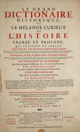 Ebert 14387. Brunet III, 1901. Lenz 98: "Das erste große Lexikon Europas in einer lebenden Sprache...". - Vorliegende Ausgabe bereits stark erweitert mit Begriffen aus Länder- und Völkerkunde, eingefügt sind auch Künstler, Politiker, Wissenschaftler, Firmen und Handelsgesellschaften, Drogen (Kaffee, Tee etc.). - Starke Gebrauchsspuren, nicht auf Vollst. kollat., mehrere Lagen mit Fehlst. - Gekauft wie besichtigt.