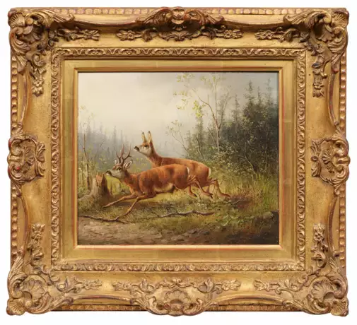 Mit feinem Pinselstrich und zart nuanciertem Kolorit gemaltes, charakteristisches Tierstück Müllers, der sich auf die Darstellung von Jagd- und Tiermotiven spezialisierte und Schüler seines Vaters und Wilhelm von Kaulbachs war. Öl/Mahagonitafel. R. u. sign. mit Ortsangabe München. 22,2 cm x 25,2 cm. Rahmen.