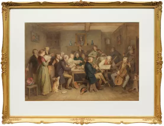 In einem Wohnraum mit Kamin und Bildern an der Wand, hat sich ein Chor aus Sängern und Sängerinnen versammelt, der von Musikern mit Klarinette, Geige, Bass und Oboe begleitet wird. Aquarell und Pastell/Papier, Lichtmaß 44 cm x 61 cm. Rahmen.