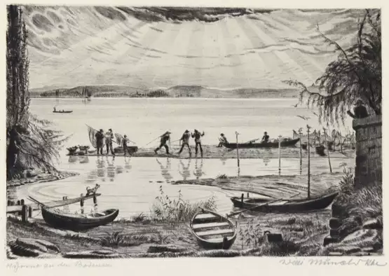 Flucht nach Ägypten, Badende Mädchen, Heimkehrende Fischer, Schwere Landung, Badende Knaben im Untersee, Fischer am Untersee, Vorüber, Parklandschaft, Bahnübergang Strecke Basel, Hymne an den Bodensee, Badende Frauen, In Badenbaden (Raben auf nassem Weg), Sommertag am Gnadensee, Im Mondlichte (Angler), In Badenbaden (Kutsche), Alter mit Pelzkappe (dat. 1911 u. bez. "Originalhanddruck No. 14"). - Alter mit Unterl. Randausriss links, wenige Bl. etw. stockfl. Nr. 114, 115, 121, 129, 136, 137, 139, 142, 143, 144, 151, 152, 153.