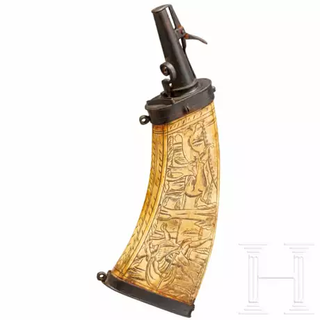 Gekrümmter Korpus aus gepresstem hellen Kuhhorn mit graviertem und geschwärztem Dekor. Schauseitig Jagdszene mit Jäger, Wolf und Hund, rs. Kreisaugendekor. Montierung aus geschwärztem Eisen, die konische Tülle mit gefedertem Verschlusshebel. Seitlich zwei Trageösen. Länge 34 cm.