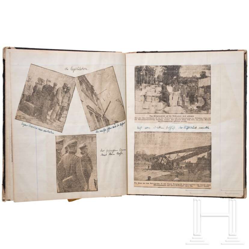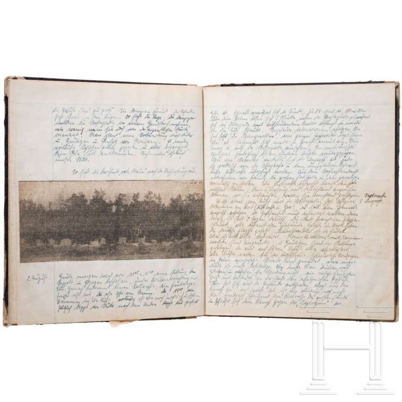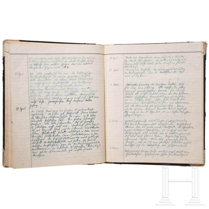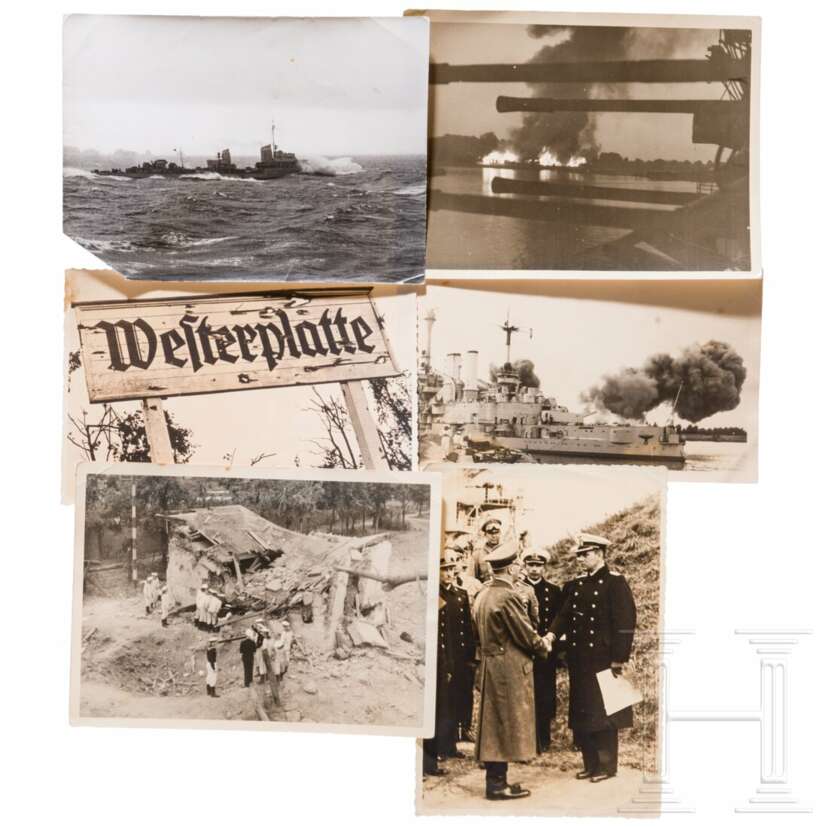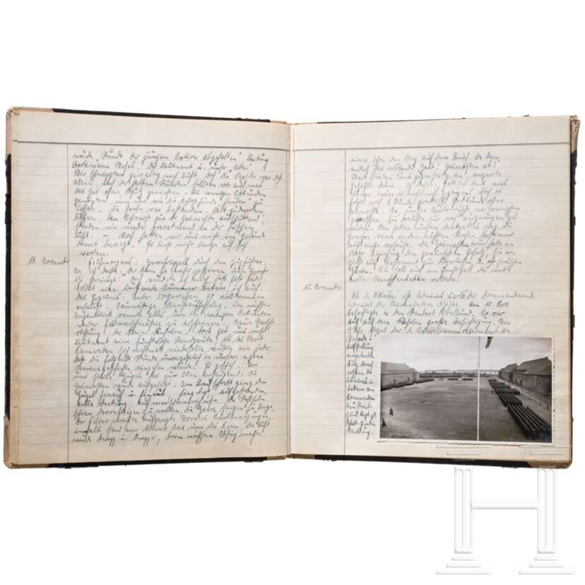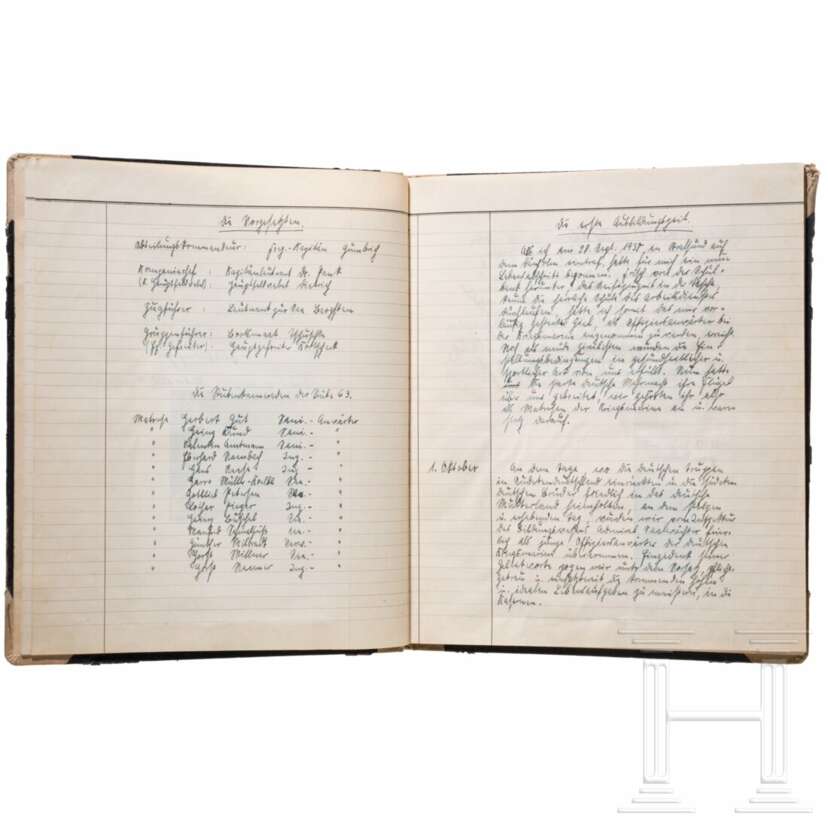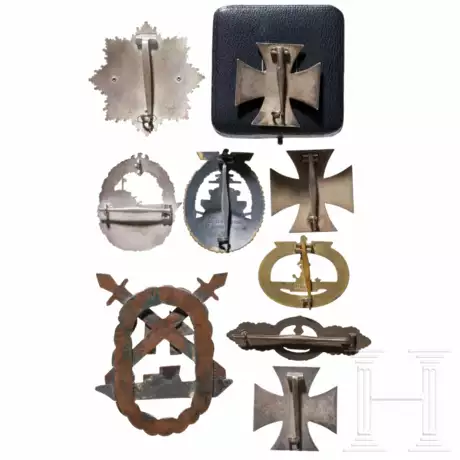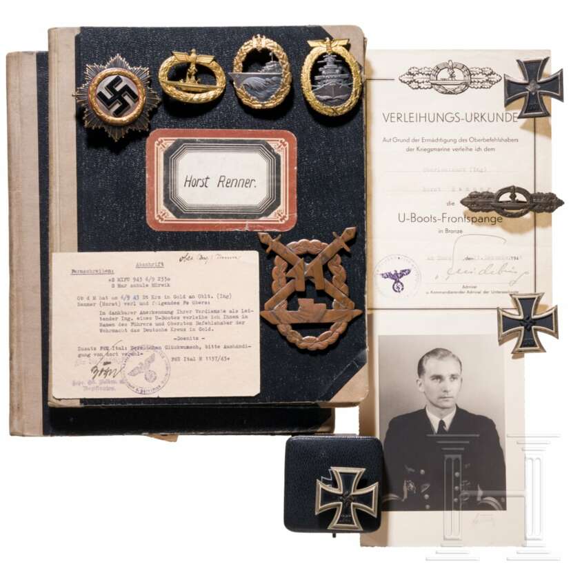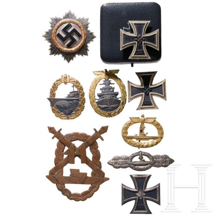 Deutsches Kreuz in Gold, Hersteller "20" (C. F. Zimmermann) auf der Nadel, schwarz emailliertes Hakenkreuz, dieses mit zwei Kratzern, vier Nieten, mehrteilige Fertigung, Gewicht 44,85 g (leichte Ausführung). U-Boot-Kriegsabzeichen, Buntmetall vergoldet, Hersteller "Schwerin Berlin". Flottenkriegsabzeichen, Buntmetall, vergoldeter Kranz, Hersteller "Schwerin Berlin". Zerstörer-Kriegsabzeichen, Buntmetall, vergoldeter Kranz, ohne Hersteller, jedoch typisches B.H.-Mayer-Stück. U-Boot-Frontspange in Bronze, Feinzink bronziert, Hersteller "Schwerin Berlin", magnetische Nadel. Drei Eiserne Kreuze 1. Klasse 1939, eines im orig. Etui, bei einem wurde das Hakenkreuz entfernt, Hersteller "20" und "L/13" (Mikropunze). "Abschrift Fernschreiben" bzgl. der Verleihung zum Deutschen Kreuz in Gold, verliehen am 06.09.1943. Urkunde zur U-Boot-Frontspange in Bronze, ausgestellt am 21.12.1944, OU Admiral Hans-Georg von Friedeburg. Ein sehr schönes Portraitfoto, er trägt u.a. das Deutsche Kreuz in Gold. Zwei "Logbücher" (Tagebücher) von 1938 bis 1939 mit eingeklebten Fotos und Zeitungsausschnitten, anbei noch sieben weitere Fotos. Wappen mit der Zahl "11", vermutlich auf Schiffsversenkungen beziehend.