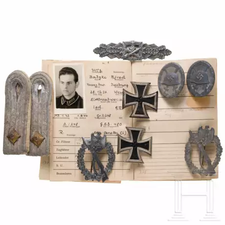Nahkampfspange in Bronze, Hersteller "FLL" (Friedrich Linden Lüdenscheid), zwei Eiserne Kreuze 1. Klasse 1939, Hersteller "3" und "L/11" (beide W. Deumer), Eisenkern, zwei Infanterie-Sturmabzeichen in Silber, Zink, zwei Verwundetenabzeichen in Silber, Zink, eines mit der Herstellermarkung "L/57" (Boerger & Co.), ein Paar Schulterklappen der Infanterie für einen Oberleutnant mit Schlaufen, Beurteilungsbuch "Schule 1 für Fahnenjunker der Infanterie", alle 35 Soldaten mit Passbild und militärischer Beurteilung. Der Nachlass kommt direkt aus Familienbesitz. Alters- und Gebrauchsspuren.