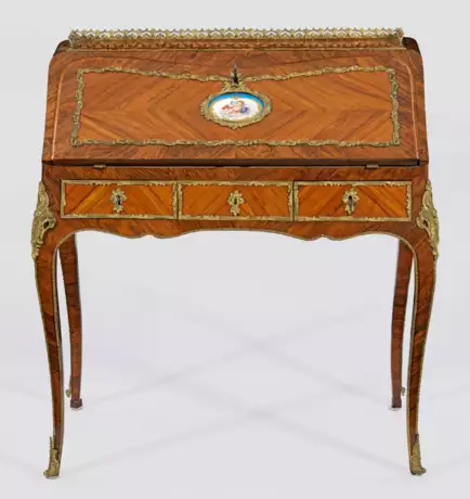 Palisander und Rosenholz furniert sowie Applikationen aus vergoldeter Bronze. Bombierter Korpus auf hohen, geschweiften Beinen. In der gegliederten Front drei Schubfächer sowie schräggestellte, abklappbare Arbeitsfläche mit profilgerahmter, polychrom gestalteter Porzellanplakette. Dahinter gestaffelte Facheinteilung. Schauseitig profilgerahmte, gespiegelt angeordnete Furnierfelder. Altersspuren. H. 89 cm. 82 cm x 45 cm.