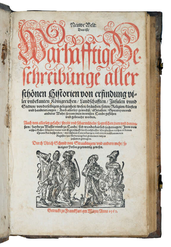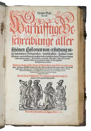 In 1567 Sigmund Feyerabend published these works in two issues: 1) as a continuation of Sebastian Franck's Weltbuch in which this volume was entitled Ander theil dieses Weltbuchs von Schiffahrten; 2) separately, as here. In addition to the different titles, different woodblocks are used to illustrate the title-pages. In this separate issue, there is an attempt at ethnographic illustration—drawing attention to the exotic content of this volume as a separate work. Priority (if it exists) has not been determined. Both issues are extremely rare. Not in Borba; European Americana 567/50; JCB I, 237; Palau 304834; Sabin 77678; VD16 G2603 (Goldwurm).