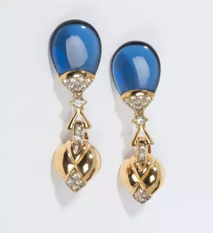 Aus goldfarbenem Metall mit Strassbesatz. Tropfen-Dekor aus blauem Glas. L 5,5 cm.