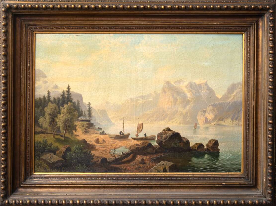 Lot 146 | Nocken, Wilhelm Theodor (1830 Düsseldorf-1905 ebenda) "Gebirgslandschaft mit See", Öl/Lw., sign. u.l., 65,5x95 cm, Rahmen