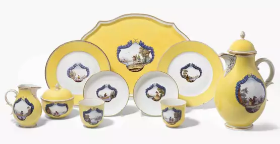 20.Jh. Porzellan. Gelber Fond. Schauseite mit Figuren vor Landschaftskulisse. Umrandung mit stilisierten dunkelblauen Blumengirlanden. Goldstaffierung. Bestand: 1 Mokkakanne, 1 Crémier, 1 Zuckerdose, 6 Mokkatassen mit Untertassen (H 5,5 cm), 6 Dessertteller (D 19 cm), 1 Tablett. Total 16 Teile.