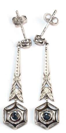 Lot 884 | Ohrstecker im Art-Deco-Stil, 925er Silber rhodiniert, zus. 6 Brillanten zus. ca. 0,12 ct., 2 Saphire zus. ca. 0,30 ct., Länge 3,5 cm