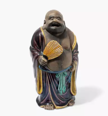 Japan, 20.Jh. Steinzeug, tlw. mit polychromer Glasur in Kutani-Farben. Herzhaft lachender Glücksgott Hotei, seinen Fächer in der rechten Hand haltend. H 24 cm.