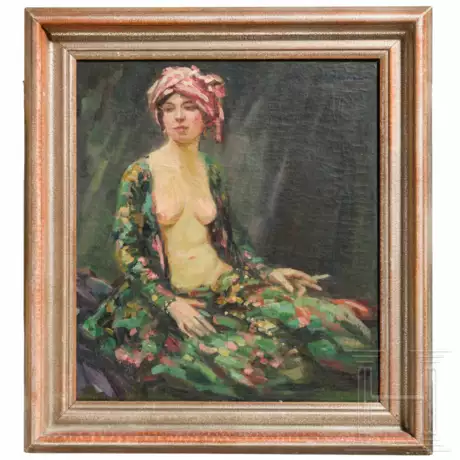 Öl auf Leinwand. Porträt einer wohl en plein air sitzenden Konkubine in schillernd buntem Mantel beim Rauchen. Die rechte obere Ecke unleserlich signiert. Craquelé. Unterhalb des linken Oberschenkels eine sehr kleine Lochung. Im gekehlten und versilberten Holzrahmen mit kräftigem Profil, verso auf dem Keilrahmen ebenfalls unleserlich bezeichnet. Bildmaße 56 x 50, Maße gerahmt 72 x 66 cm.