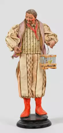 Orientaler mit kurzem, braunem Haar und kräftigem Schnauzbart in Tracht des 18. Jh., einen kleinen Vogelbauer mit Vogel tragend. Terrakotta naturalistisch gefasst, Glasaugen, Stoff, Holz. Runder, ebonisierter Holzsockel, neuzeitlich. Ges.-H. 25 cm. Minim. besch./Alters- und Gebrauchsspuren.