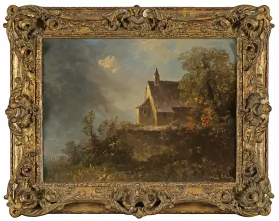 Atmosphärisch dichte Darstellung einer von der Sonne beschienenen Kapelle auf einem Felsvorsprung bei dunkel heraufziehendem Unwetter. Das Werk stellt eine charakteristische, kleinformatige Impression aus Mulleys Kufsteiner Schaffensperiode (1918-1934) dar, in der er einen individuellen, in pastoser Spachteltechnik ausgeführten, flächigen Malstil für seine Alpenlandschaften entwickelte, bei denen er vornehmlich alte Berghöfe und Kapellen ohne Personenstaffagen spannungsreich inszenierte und die Erhabenheit der Hochgebirgswelt zum Ausdruck brachte. Hierdurch erneuerte er die Gebirgsmalerei im 20. Jh. in moderner Weise. Öl/Hartfaser. R. u. sign.; 30 cm x 40 cm. Rahmen.