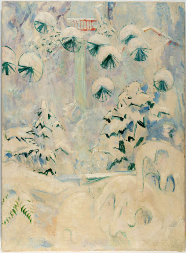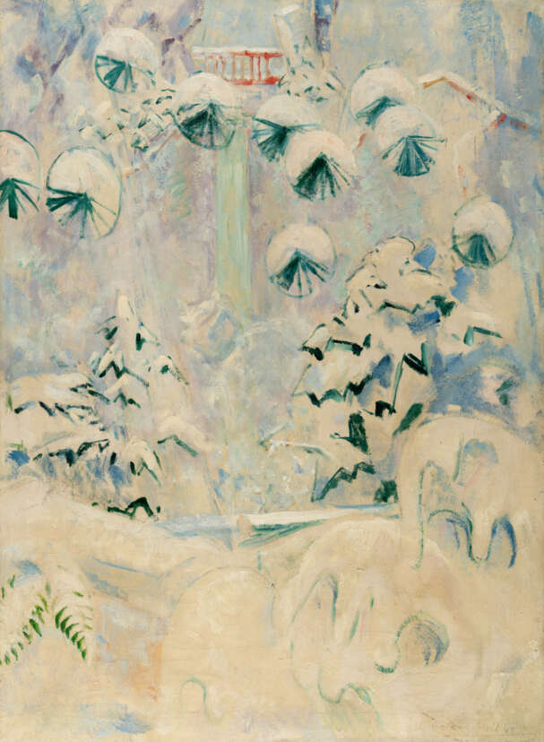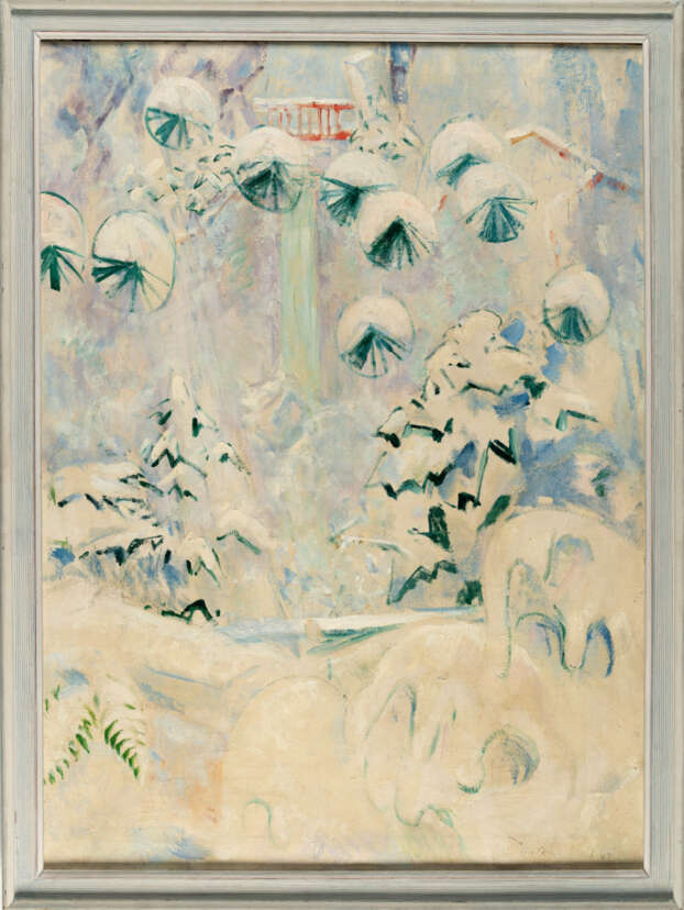 Lot 573 | Oskar Moll. Snowy landscape with red bridge
