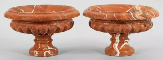 Orange-roter, weiß und hellgrau gemaserter, sog. "Rouge Royal"-Marmor. Kurzer Balusterschaft als Träger für flache, umlaufend godronierte Schale mit profiliertem Lippenrand. Rep.; H. 20 cm. D. 32 cm.